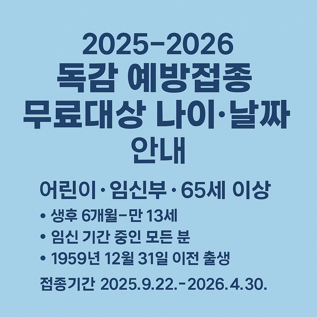 2025-2026 독감 예방접종 무료대상 어린이·임신부·65세 이상 어르신은 매년 국가에서 인플루엔자(독감) 예방접종을 무료로 지원합니다. 올해 절기(2025-2026)의 대상 나이와 접종기간을 한 번에 확인할 수 있도록 정리했습니다.목차무료 접종 대상 핵심 요약무료 접종 대상 나이·조건2025-2026 접종 날짜 정리접종 준비물·주의사항자주 묻는 질문1. 무료 접종 대상 핵심 요약2025-2026절기(2025년 9월 ~ 2026년 4월)의 독감 무료접종은 다음 네 그룹이 대상입니다.어린이: 생후 6개월 ~ 만 13세임신부: 임신 여부 확인되면 전원 무료65세 이상 어르신: 1960년 12월 31일 이전 출생자일부 50~64세 취약계층: 지자체별 확대 지원2. 무료 예방접종 대상 나이·조건2-1. 어린이..