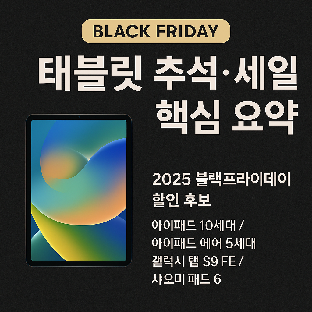 2025 블랙프라이데이 태블릿 추천을 정리했습니다. 아이패드, 갤럭시탭, 샤오미 패드 할인 정보와 어디서 가장 저렴하게 구매할 수 있는지, 프리세일부터 본 세일까지 구매 타이밍을 안내합니다.블랙프라이데이는 태블릿 할인 폭이 가장 큰 시기로, 특히 아이패드·갤럭시탭·샤오미 패드의 거래량이 폭발합니다. 올해도 “블랙프라이데이 태블릿” 키워드가 검색 상위권을 차지하고 있어, 필요한 정보를 한 번에 정리했습니다.목차2025 블랙프라이데이 태블릿 BEST 5브랜드별 할인 예상폭 정리어디서 사는 게 가장 싸냐?구매 타이밍별 추천 전략용도별 최적 태블릿 추천 2025 정부지원금·디지털 바우처 확인하기 1. 2025 블랙프라이데이 태블릿 BEST 51) 아이패드 10세대할인 폭: 15~25%학생·업무용 수요 가장 많음..