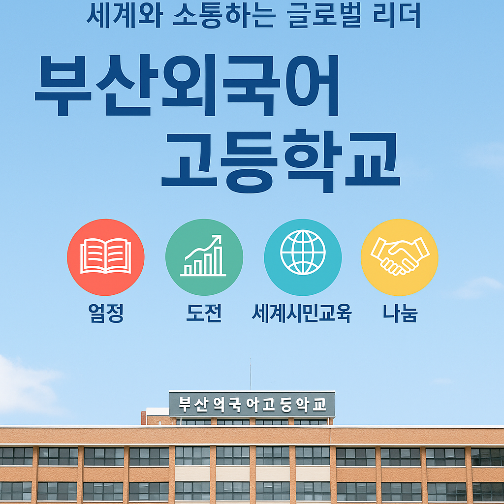 0. 부산외고 한눈에 보기부산외고 공식 홍보 포스터. 학교의 가치와 비전을 시각적으로 잘 담아낸 이미지입니다.1. 학교 소개부산 금정구 부곡동에 위치한 부산외국어고등학교(이하 부산외고)는 1997년 개교 이후 외국어 교육에 특화된 명문 고등학교로 자리매김했습니다. 외국어 교육에 집중된 교육과정, 글로벌 프로그램, 국내외 대학 진학 성과 등 다양한 면에서 주목받고 있으며, 현재까지 수많은 졸업생이 국내외에서 활발히 활동 중입니다.학생들은 입학 후 전공 언어를 선택해 심화된 외국어 교육을 받으며, 언어적 능력은 물론 국제 감각, 사고력, 인성까지 고루 갖춘 글로벌 인재로 성장하고 있습니다.2. 외국어 중심 교육과정부산외고의 가장 큰 특징은 전공 언어 중심의 체계적인 교육과정입니다. 개설 언어는 영어, 일본어..