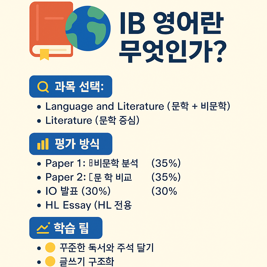 🏫 IB 영어란 무엇인가?IB(International Baccalaureate)는 전 세계에서 인정받는 국제 교육 프로그램으로, 고등학교 과정인 DP(Diploma Programme)는 16~19세 학생을 대상으로 하는 고난도 커리큘럼입니다. 그 중에서도 IB 영어(English A: Language and Literature)는 학생들의 비판적 사고, 텍스트 분석 능력, 언어 표현력을 길러주는 핵심 과목입니다.🔍 IB 영어의 과목 구성과목명설명대상English A: Language and Literature언어와 문학 분석, 비문학/미디어 텍스트 포함영어 원어민 수준 학생English A: Literature전통 문학 중심, 소설/시/희곡 분석고급 문학 해석 역량 원하는 학생English B영어 ..